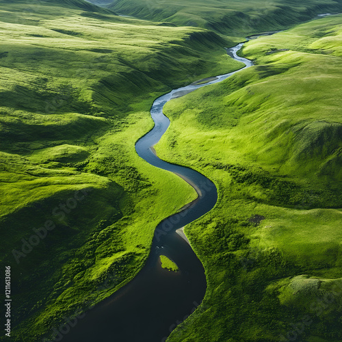 Serpentine River Through Lush Valley: An aerial view captures a winding river snaking through a vibrant green valley, creating a breathtaking landscape of natural beauty and serenity.