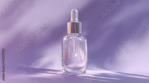 Serum bottle sparkles on purple backdrop, ideal for beauty product marketing or web design, conveying luxury skincare concept.
