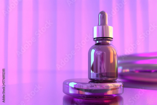 Serum dropper bottle with glass base on shiny surface in pink and purple light. Modern cosmetic skincare product, beauty trend, hydration.