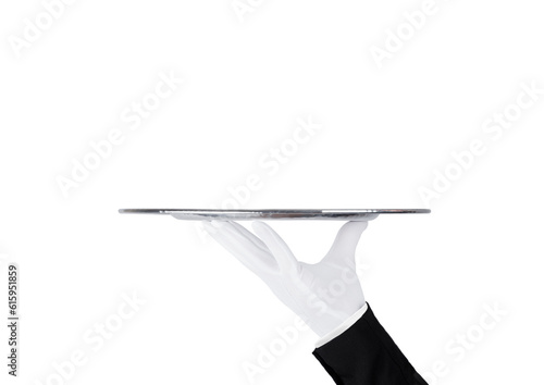 Servant wearing white glove holds stainless steel tray on white background