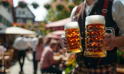 Server in traditional dress serving beer mugs to guests at the Oktoberfest festival.