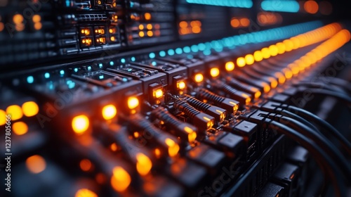 Server Rack with Glowing Cables. Generative AI