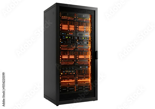 server racks filled with electronic equipment and glowing lights isolated on transparent background