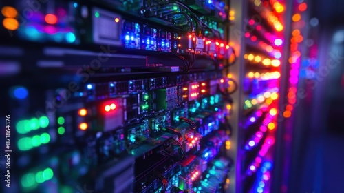 Server racks illuminated by blinking, colorful lights, processing vast amounts of big data while showcasing robust internet connectivity in a cutting edge data center environment