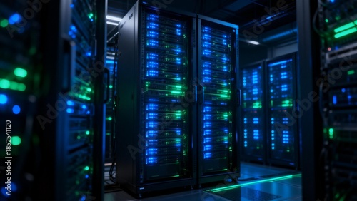 Server racks with illuminated lights in data center