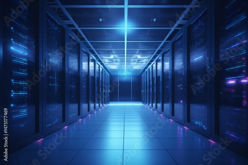Server Room Corridor: Data Center Interior with Rows of Servers and Bright Blue Lighting