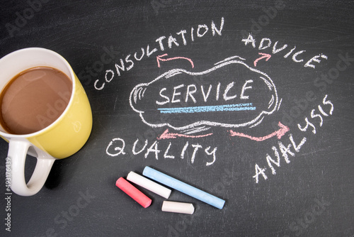 Service. Coffee mug and text on a blackboard background