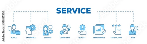 Service icon infographic illustration concept with icon of advice, experience, support, competence, quality, performance, satisfaction, help, and call center icon png and easy to edit