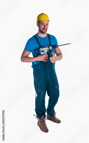 Serviceman holding a drill on white background