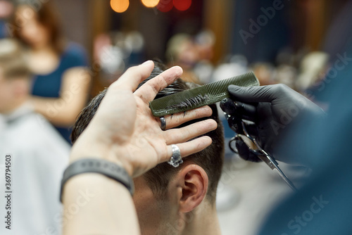 Serving client. Professional male barber making haircut for a young guy visiting barbershop or hair salon