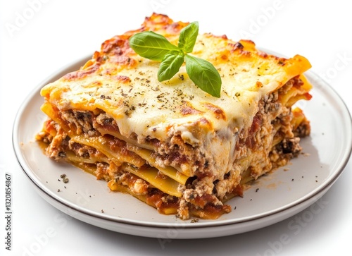 Serving of Lasagna on a Plate Topped with Basil Leaves Close-up