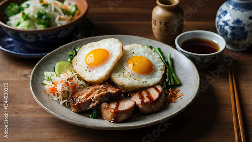 Serving Vietnamese Broken Rice Dish with Fried Eggs and Grilled Pork
