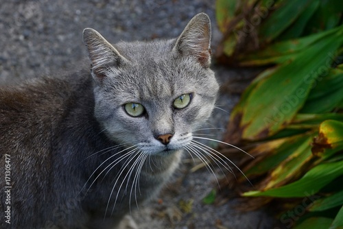 серый кот во дворе на дороге у зелёных листьев