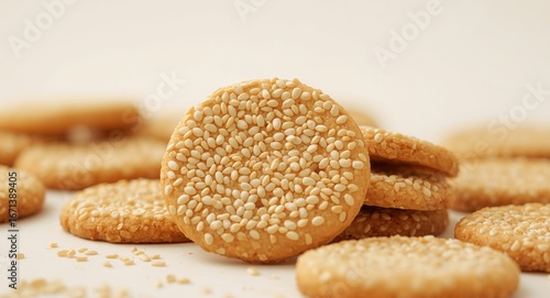 Sesame Seed Cookies Stack, Sweet Bakery Products on White Background, Closeup