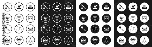 Set Abacus, Soccer goal with ball, Swing boat, Baseball bat, Double swing, Horse saddle, Boat and Kite icon. Vector
