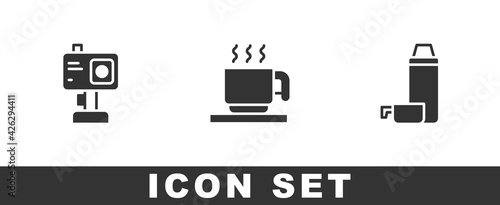 Set Action camera, Hot chocolate cup and Thermos container icon. Vector