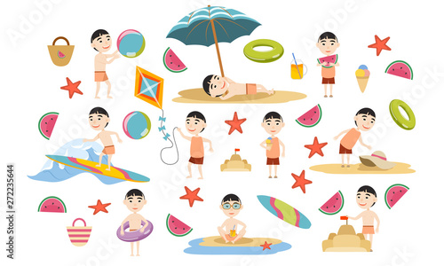 Set Asian boy in various poses in summer clothes and swimsuits on the beach. Summer holidays. Beach rest, games and surfing. Vector illustration