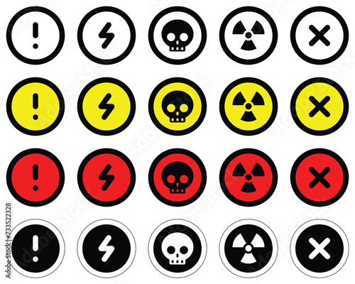set attention circle different colors sign warning electric alert radioactive cross traffic symbol caution hazard danger badge road mark vector flat design for web mobile isolated white Background