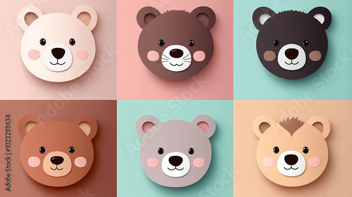 Set Bear card templates. Cute cartoon bear faces,paper art and digital craft style.