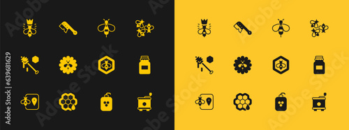 Set Bees, Honeycomb, and honeycomb, Cosmetic tube with, flower, Queen bee and Beekeeping brush icon. Vector
