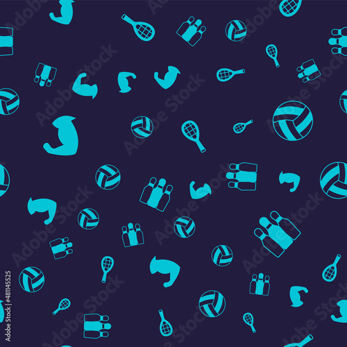 Set Bodybuilder showing his muscles, Volleyball ball, Tennis racket and Bowling pin on seamless pattern. Vector