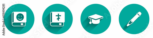 Set Book, Holy bible book, Graduation cap and Pencil with eraser icon with long shadow. Vector