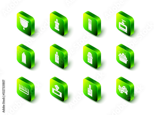 Set Bottle for cleaning agent, Shaving gel foam, of shampoo, Basin with soap suds, Sponge, Antiperspirant deodorant roll, and Wet wipe pack icon. Vector