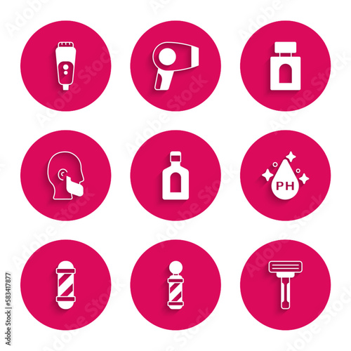 Set Bottle of shampoo, Classic Barber shop pole, Shaving razor, Oil for hair care treatment, Mustache and beard, Aftershave and Electric blade icon. Vector