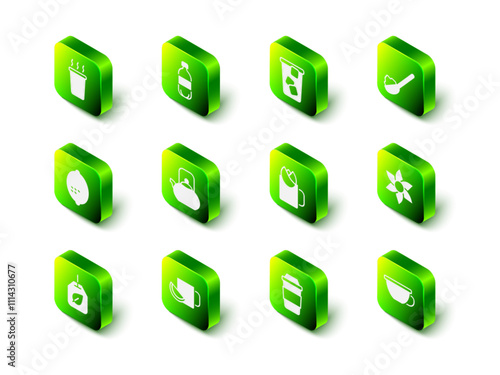 Set Bottle of water, Ice tea, Spoon with sugar, Flower, Cup, rose, and lemon icon. Vector