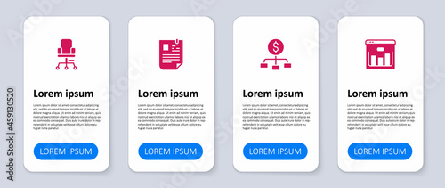 Set Browser with stocks market, Hierarchy dollar, Resume and Office chair. Business infographic template. Vector