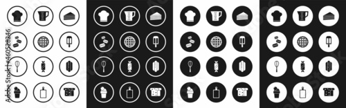 Set Cake, Homemade pie, Macaron cookie, Chef hat, Ice cream, Measuring cup, Hotdog sandwich and Kitchen whisk icon. Vector
