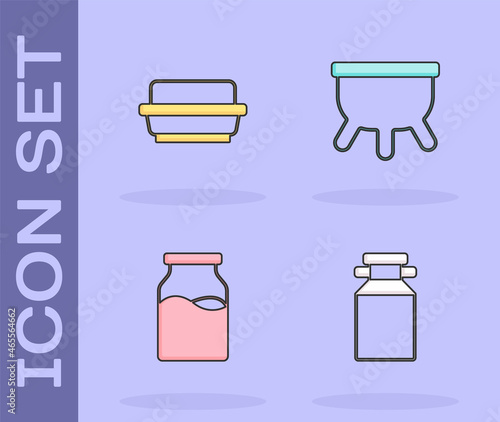 Set Can container for milk, Butter butter dish, Bottle with and Udder icon. Vector