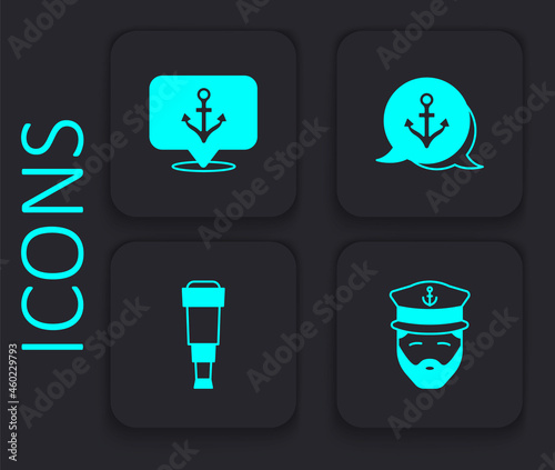 Set Captain of ship, Anchor, and Spyglass telescope lens icon. Black square button. Vector
