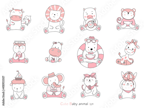 Set cartoon character the lovely baby animals on white background. Hand-drawn style.
