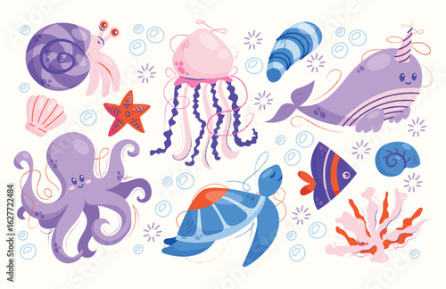 Set cartoon sea animals octopus, jellyfish, turtle, narwhal, starfish, fish, snail, mussel, seashell, and coral. Flat vector illustration marine life and underwater world concept