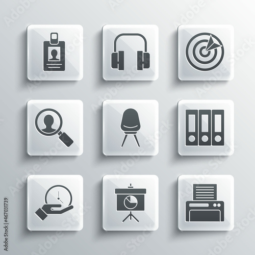 Set Chalkboard with diagram, Printer, Office folders, chair, Clock, Magnifying glass for search people, Identification badge and Target sport icon. Vector