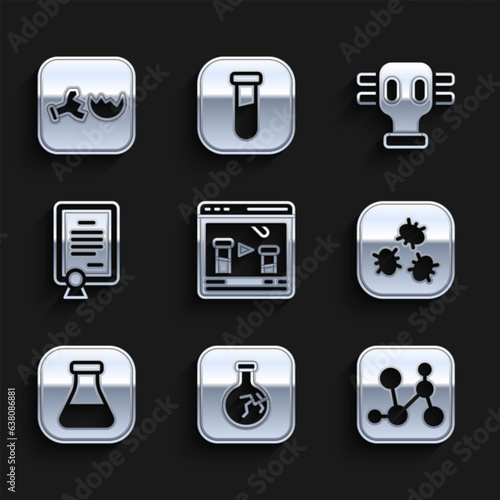 Set Chemical online, Cracked flask, formula, Bacteria, Test tube and, Certificate template, Gas mask and Broken icon. Vector