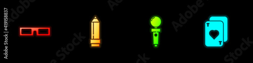 Set Cinema glasses, Pencil with eraser, Joystick for arcade machine and Playing cards icon. Vector.