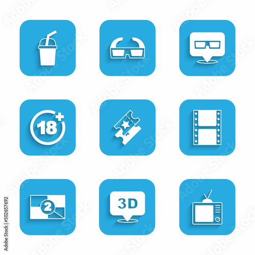 Set Cinema ticket, 3D word, Retro tv, Play video, Old film movie countdown frame, Plus 18, cinema glasses and Paper with water icon. Vector