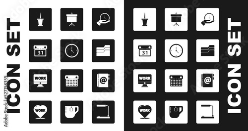 Set Clock, Calendar, Push pin, Document folder, Chalkboard with diagram, Address book and Monitor text work icon. Vector