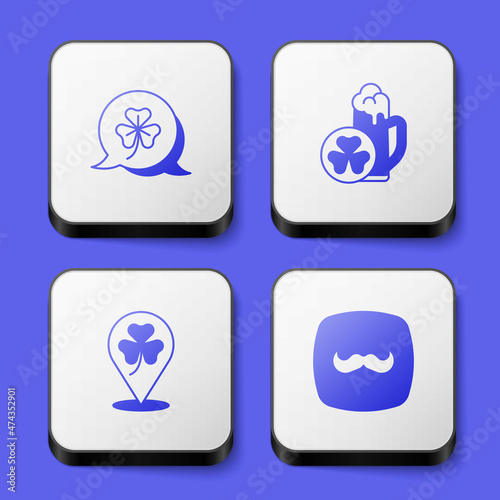 Set Clover trefoil leaf, Glass of beer, and Mustache icon. White square button. Vector