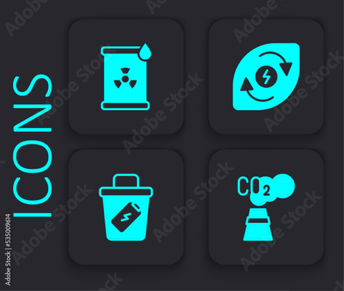 Set CO2 emissions in cloud, Radioactive waste barrel, Water energy and Trash can icon. Black square button. Vector