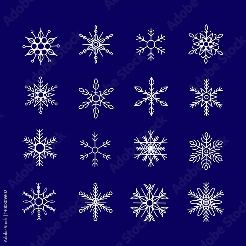 Set collection of 16 various ornate snowflakes, white snowflake star symmetric hexagon symbols placed on dark blue background, for prints, decoration, etc