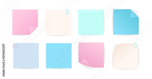 Set colored square paper reminder, sticky note, realistic checkered,striped marks, paper clip. Vector illustration with shadow on white background