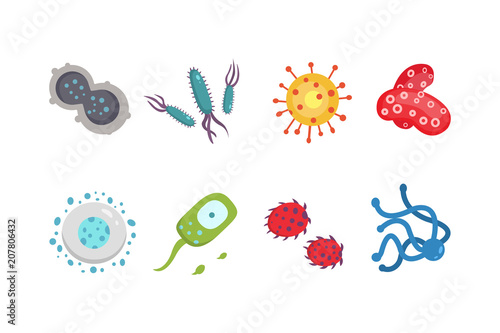 Set colorful viruses vector illustration. Bacteria and micro-organisms in cartoon style.