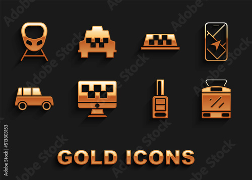 Set Computer call taxi service, City map navigation, Tram and railway, Car key with remote, Taxi car roof, High-speed train and icon. Vector