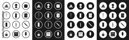 Set Cooking pot, Moka, Food chopsticks, Citrus fruit juicer, Refrigerator, Blender, Rolling pin and icon. Vector