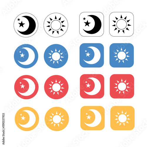 Set dark mode, light mode, On Off toggle switch buttons. day night switch toggle - dark mode, light mode switch button - sun and moon icons.