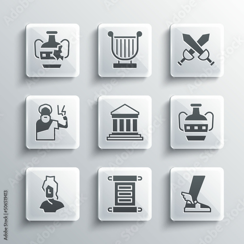 Set Decree, parchment, scroll, Hermes sandal, Ancient amphorae, Parthenon, bust sculpture, Zeus, Broken and Crossed medieval sword icon. Vector