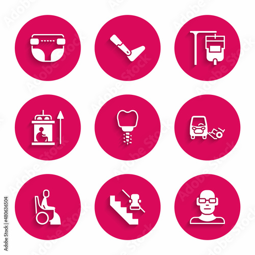 Set Dental implant, Disabled elevator, Poor eyesight, car, Woman in wheelchair, Elevator for disabled, IV bag and Adult diaper icon. Vector